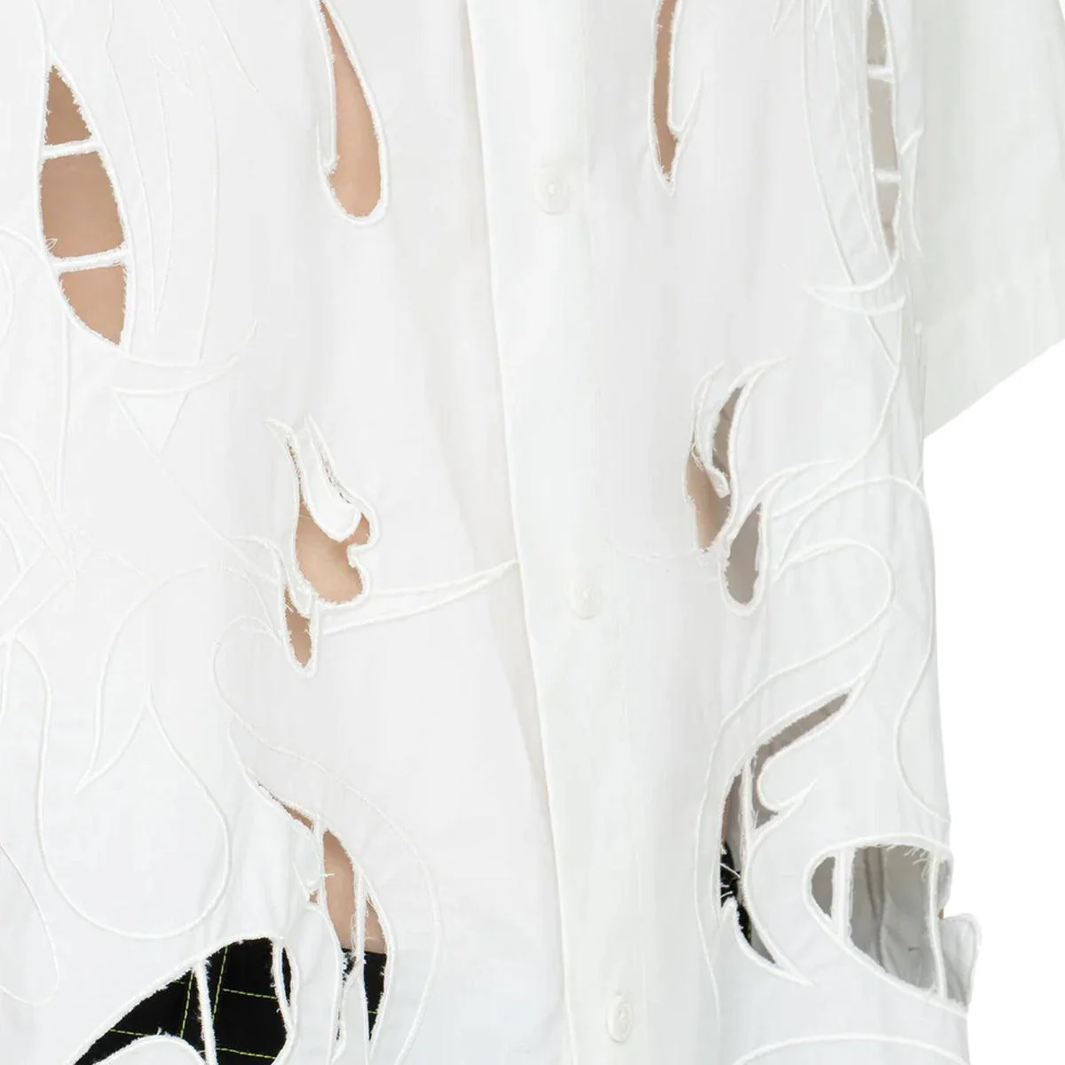 This white short-sleeved shirt is made of cotton and features the iconic Phoenix through a unique embroidered and cutout technique to the front. It has a button closure and is designed for a loose, boxy silhouette.