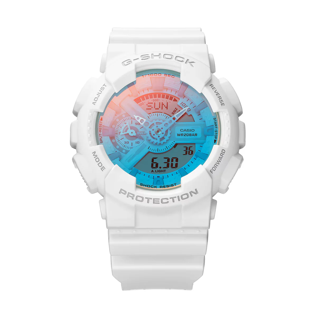 Set your mood to summertime and easy with a radiant G-SHOCK featuring a watch face in eye-catching color. This special vapor deposition process reflects various hues of light, capturing the vistas of the ever-changing seaside. These beach-inspired designs come in two color schemes — fresh white and blue evoking sun-drenched white sandy beaches, and cool translucent grey and orange conjuring the serenity of the beach at dusk. Thanks to this special coloring process, each watch shines with a different radiance for a one-of-a-kind look that is truly your own.