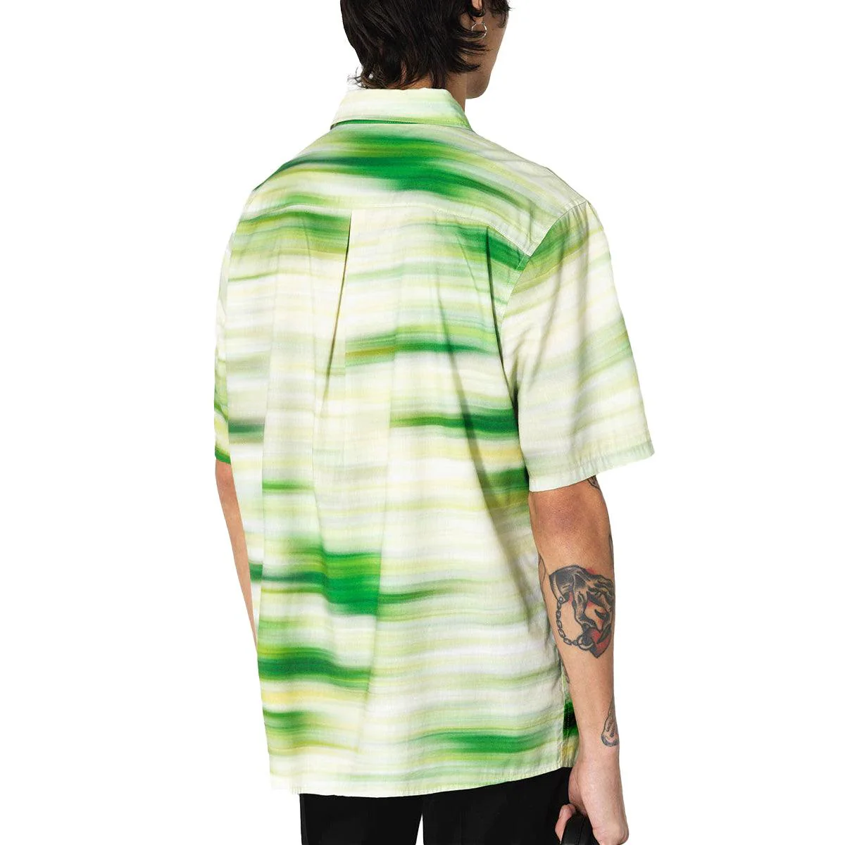 Exploring the idea of people on the move, three styles highlight Motion Meadow, featuring the same artwork at different speeds. The SS Cloak Button Up iteration is the 'fast' representation of the 'Meadow' print.