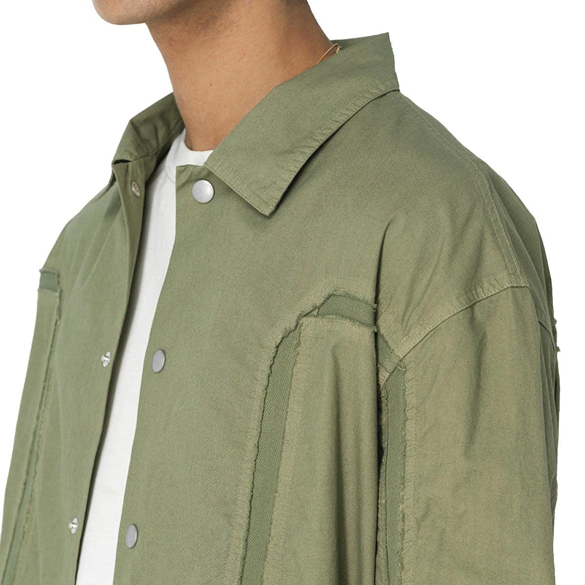 Relaxed fit shirt in lightweight cotton poplin combined with heavy herringbone tape. This shirt features a snap button closure, barrel cuffs, and a point collar. The shirt's hem includes a cinching system to adjust styling. Rivet detailing throughout.