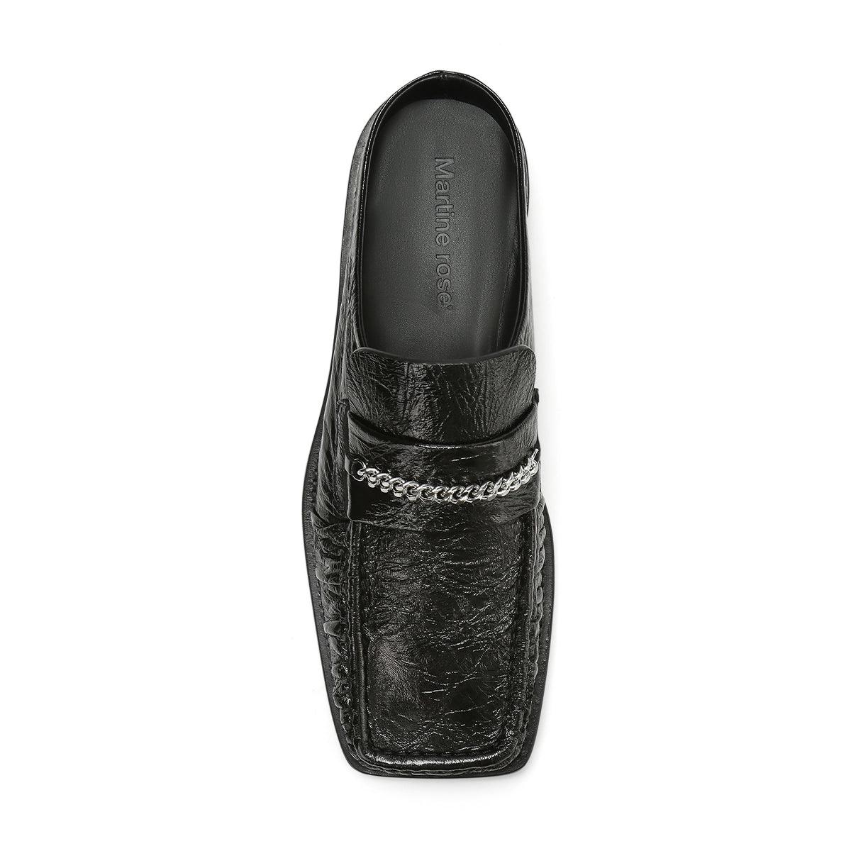 Backless leather high shine mule with a square toe and finished with a silver front chain