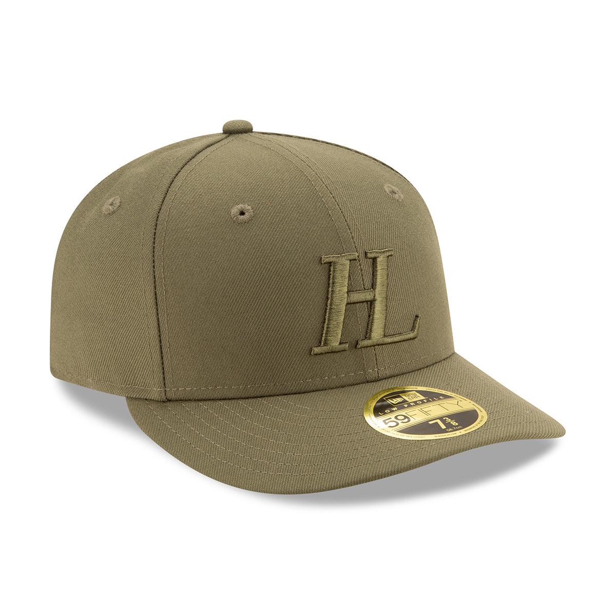 The Helmut Lang Olive Low Profile 59FIFTY Fitted features an olive fabrication with a tonal embroidered Helmut Lang monogram at the front panels.