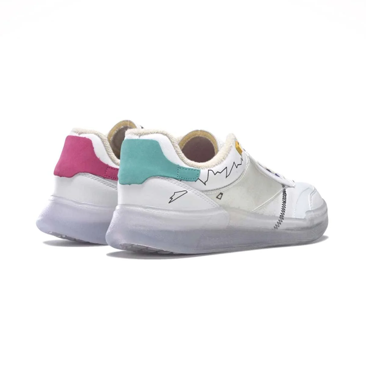 Show off your love for Jurassic Park in these Reebok shoes, inspired by the all-knowing Mr. DNA. Colors on the leather upper were inspired by the iconic DNA helix. Graphics from the movie include a cracked dinosaur egg on the collar and bubbles on the heel.