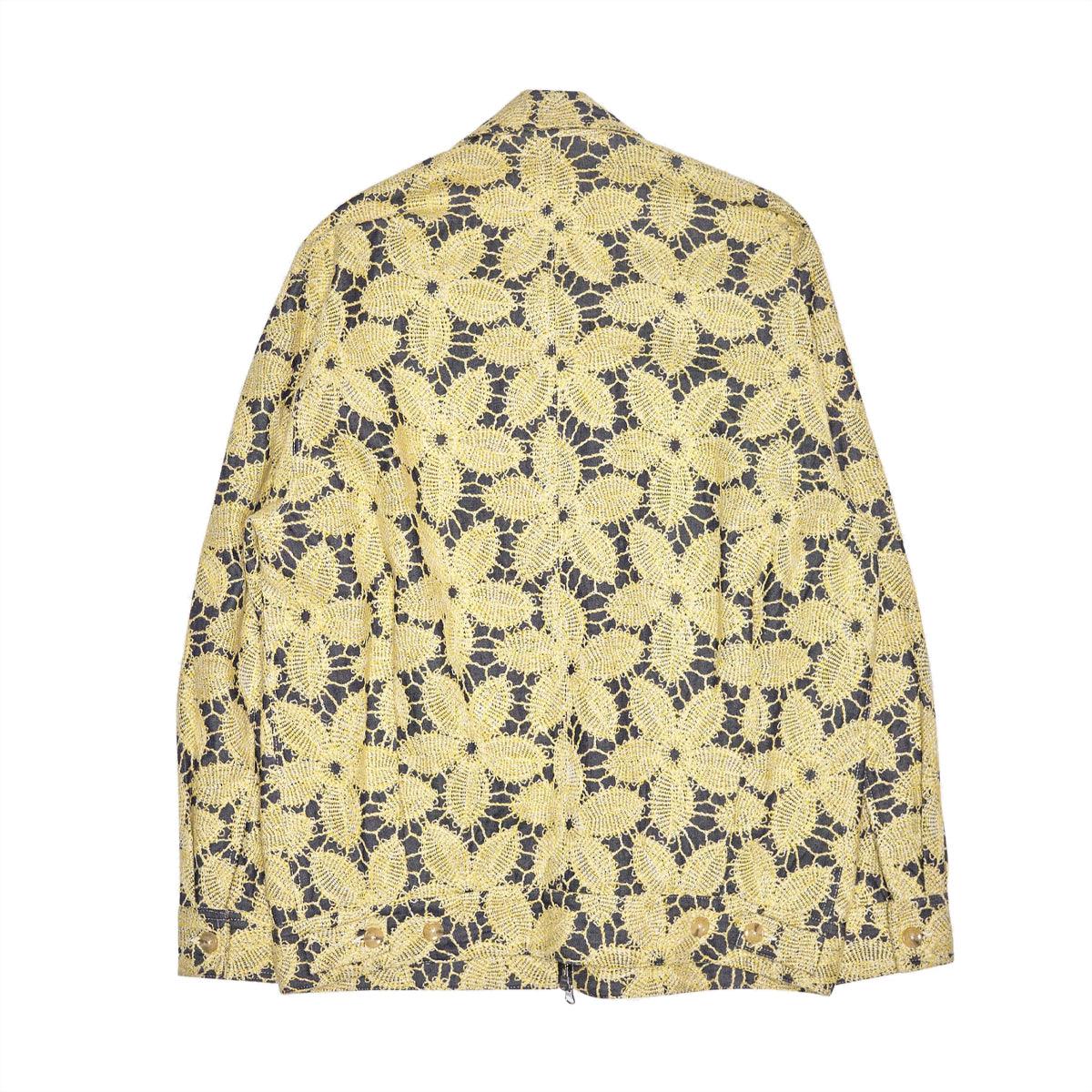 Fully lined blouson jacket in a floral detailed embroidered denim. Featuring a welt chest pocket, adjustable button tabs at back, single-button barrel cuffs and seasonal "Coffee Bean" brass chain lanyard.