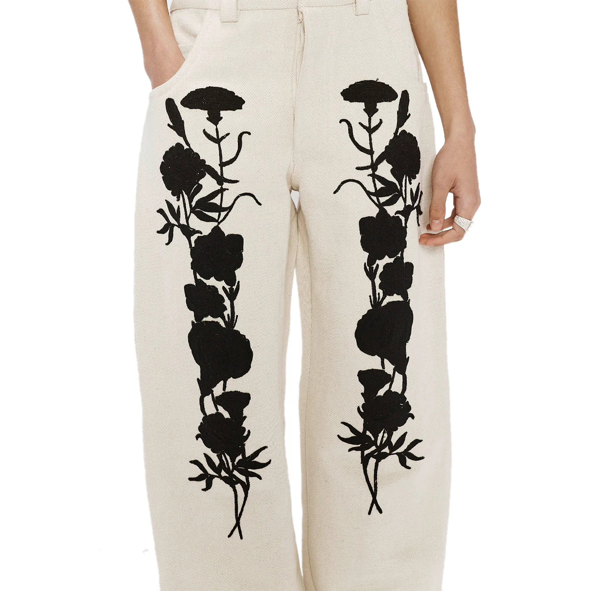Straight-leg work pant in a structured cotton drill. Featuring button-fly, five-pocket styling and embroidered foliage embelishment.