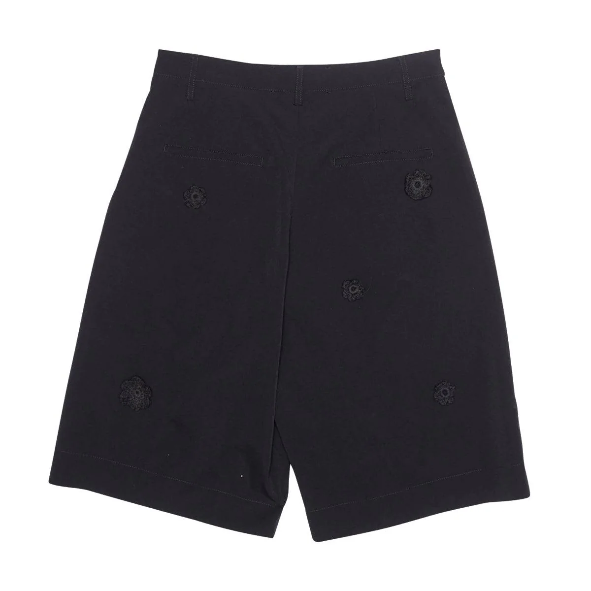 Oversized pleated shorts in a crisp recycled shirting. Featuring logo-engraved tortoise shell hardware and artisinal hand-woven floral embellishments.