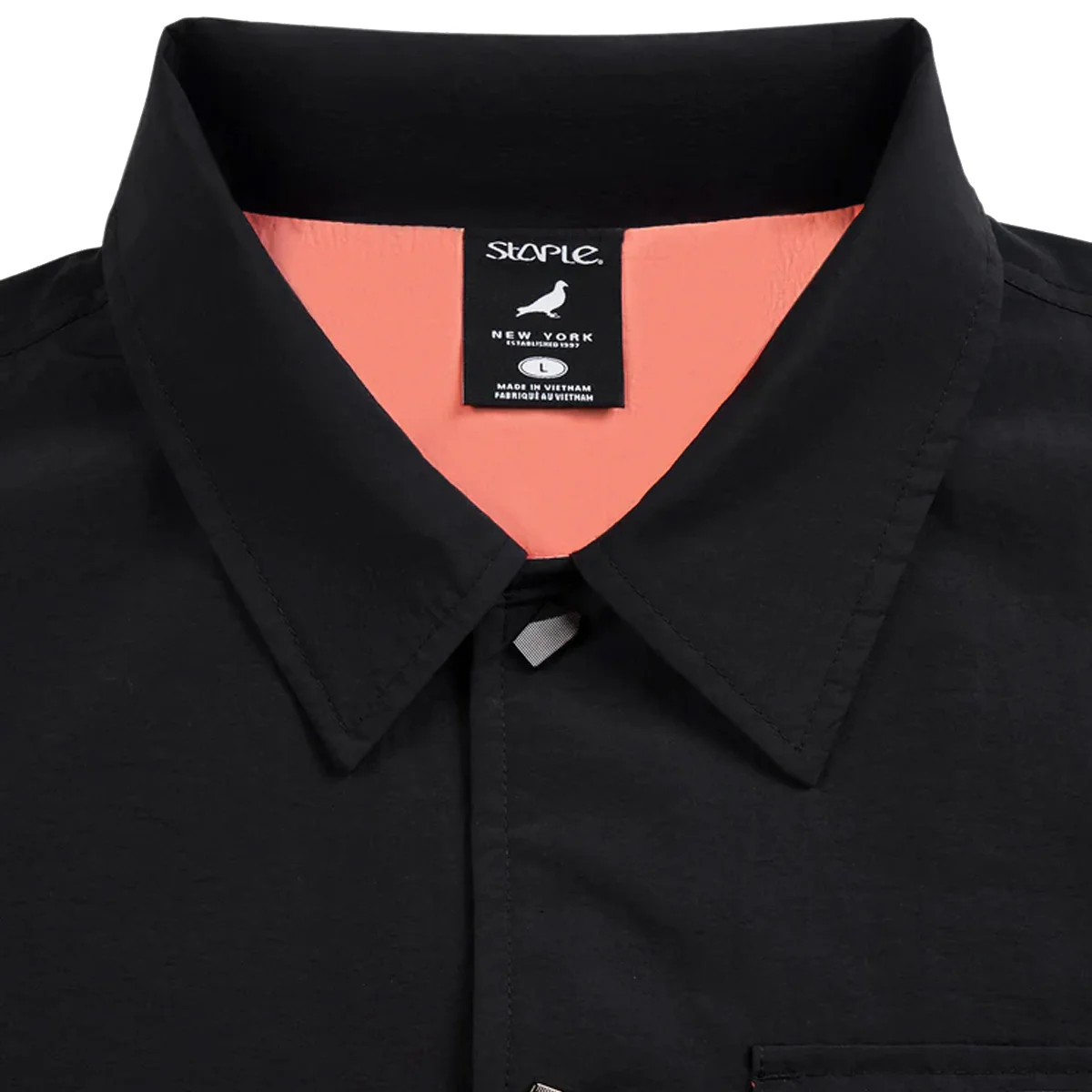 Nylon taslan coach's jacket with custom metal buttons, left chest pocket with zipper and button flap, tonal leather logo patch, angled welt pockets, adjustable waist with branded stopper, snap cuffs, gusseted back panel with storm flap for ventilation, and detachable Pigeon key ring on back neck.